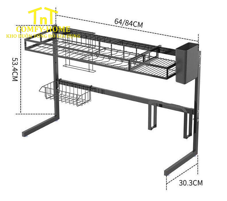 Kệ có thể điều chỉnh chiều dài linh hoạt, phù hợp với nhiều kích thước bồn rửa khác nhau, dễ lắp đặt, không cần khoan đục mặt bếp.