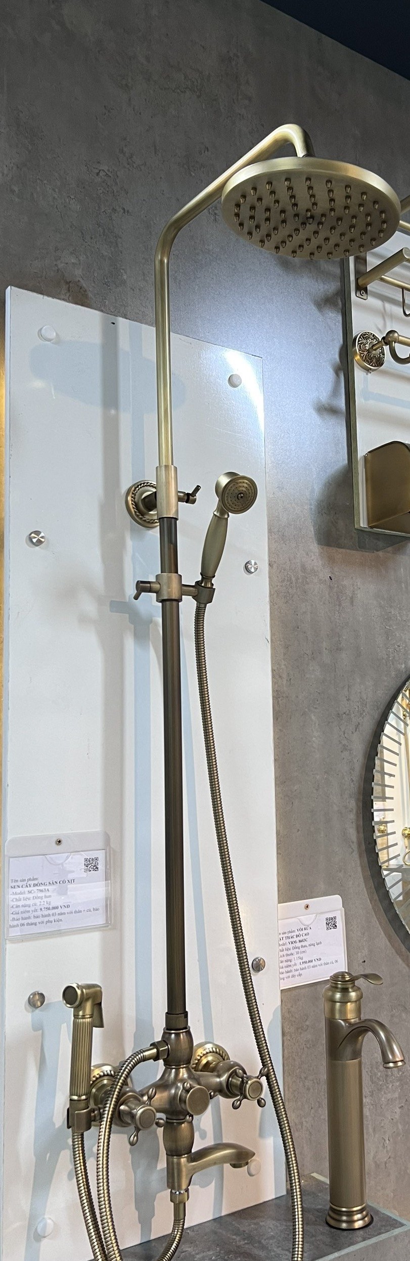 Để đạt hiệu quả thẩm mỹ tối ưu, nên kết hợp sen cây đồng giả cổ với vòi lavabo đồng, phụ kiện treo tường đồng, gương viền kim loại cùng tông màu. Sự đồng bộ này sẽ mang đến một không gian phòng tắm sang trọng, ấm áp và đậm chất nghệ thuật.